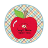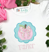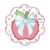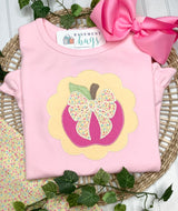 Adorable apple design available in two styles: scalloped circle with a bow and simple round circle. *Scalloped circle design will be stitched on ruffled shirt, simple circle on unisex shirts unless you leave a note during checking requesting different.