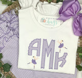 How adorable is this lavender and white applique monogram with mini ballerinas. Such a sweet combination for your little dancer. Let the everyday wear cuteness begin!