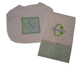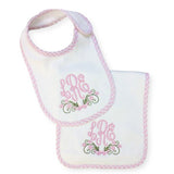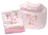 These personalized baby gift sets always receive rave reviews at the baby shower. Each set includes one monogrammed bib and one personalized burp cloth. Bibs are 100% cotton. may have snap or velcro closure. Bib edging my vary depending on availability. Burps may be 'cloth diapers' with fabric/trim added or they may have edging to match bib. Bibs and burp cloth are embroidered/appliqués within with fabric and thread and decorated with ribbon.