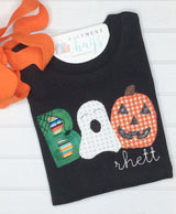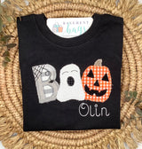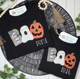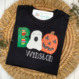 Adorable new boo design...perfect for Halloween cuteness! Stitched on 100% cotton black garments.