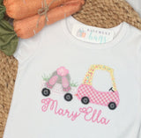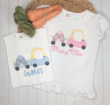 Let's drive into Spring in an adorable, iconic Little Tike's Bunny Coupe! Personalized, 100% cotton t-shirt available in white, short sleeve, straight hem for or with puff sleeves and ruffled bottom.