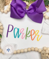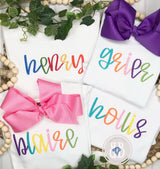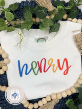 White shirt in ruffled or unisex style with name stitched in our new Daisy Handwritten Font and multicolored thread. You pick short or long sleeve.