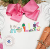 Adorable Easter character name. Each name is a unique combination of characters. Shown stitched on white. Unisex (white only) shirts also available.