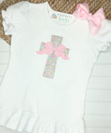 Beautifully stitched cross trimmed with a sweet bow...perfect for Spring. 100% cotton t shirt available with long and short sleeves, ruffled bottom.