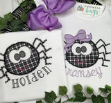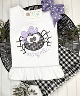Celebrate Halloween without being too spooky with this adorable gingham spider. Doesn't get any cuter than this! Purchase shirt and shorts as a set or the shirt only. Shirt available in short puffed sleeve and ruffle bottom or unisex crewneck, straight bottom. Handmade shorts have with elastic waist and attached ruffle hem. Both are made of 100% cotton and can be machine washed and best if hung to .