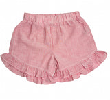 Doesn't get any cuter than this! Purchase shirt and shorts as a set or the shirt only. Shirt has short puffed sleeve and ruffle bottom. Red/white seersucker shorts have with elastic waist and attached ruffle hem. Both are machine washable and best if hung to dry.