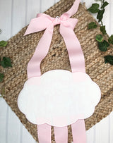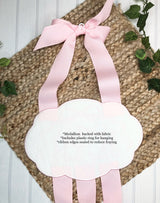 Medallion measures approximately 10" X 7". the three ribbon streamers are each about 20" long. Bow and streamer will be white. Made with craft foam, cotton fabric and grosgrain ribbon. The back is completely covered with an additional layer of fabric. Includes an plastic ring attached to top ribbon for easy hanging.