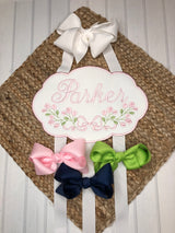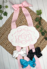 Others fabrics, designs and fonts available...just send me a message and we'll work together to design a perfect bow holder for your little princess.