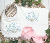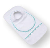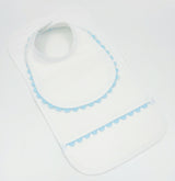 Absolutely the most classic baby bib and burp set ever. Add a simple monogram and this set becomes a perfect gift. Made of timeless 100% cotton white pique fabric with colorful ric-rack trim. Infant bib is about 7" x 5 " with velcro closure...perfect size for smaller babies. The burp cloth is approximately 9 x 16 inches. All backed in flannel.