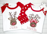 What a fun new Rudolph design. Perfect match to our Swirly Girl reindeer if you are looking for the a great sibling set. If you prefer a different color sleeve or a plain white shirt, contact me at.
