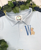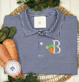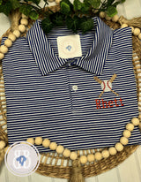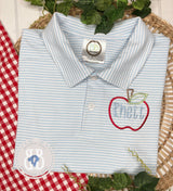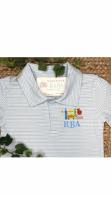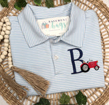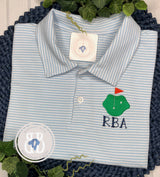 Classic polo style shirt in micro-stripe fabric can be embellished with traditional initial/monogram/name and/or a mini design. Perfect for the big boys! 100% spun cotton available in short sleeve only. Hemmed sleeve and straight bottom.
