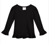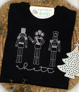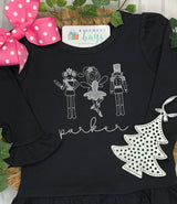 This long sleeve black tee is stunning with these favorite holiday characters stitched in white. Shirt available in crew neck and ruffled bottom styles.