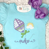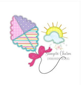 Spring feels! Adorable patchwork kite in lavenders & green. Sample shown on acqua colored shirt, price discounted and sizes very limited as that color is being discountinded...same design can be stitched on whtie shirts.