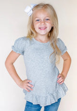 Our super soft, 100% cotton t shirt available in short sleeves, unisex crew neck or ruffled bottom in white or grey.