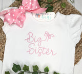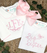 Pair big sister shirt with our sweet Boutique Footie Sleeper for baby sister/brother. (Shown in sample photo)