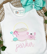 Bow trimmed sand bucket, shovel and the sweetest little crab ever give this design all the beach feels! Stitched in pinks and aqua on a white top.