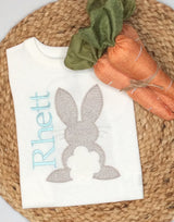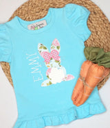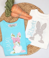 Ready to hop into Spring? This adorable personalized Simple Bunny shirt is Perfect! 100% cotton t-shirt available in white, short sleeve, straight hem for boy. For girls, light turquoise with puff sleeves and ruffled bottom.