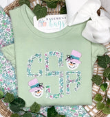 Monogram and mini snow girl design stitched on this beautiful sage green shirt. A sweet combination of beautiful floral applique initials and adorable mini snowgirls make this design super special. Let the Winter cuteness begin!