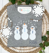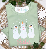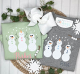 Let it snow! Adorable Snowman trio available on grey or sage (ruffled only) shirts. Name name, initials or monogram.