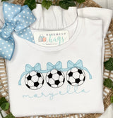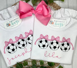 Soccer fun times three and topped with a pretty triple bow! Perfect design for your girly soccer player/fan.