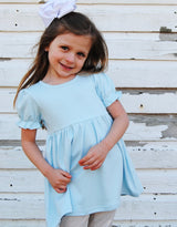 All the Spring feels with this pretty floral wreath in pinks, sage and periwinkle . This true to size, super soft, short puffed sleeve tunic is made of 95% cotton, 5% spandex. Available in soft white, aqua, and light pink.