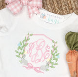 Sweet bunnies, Spring flowers, and a monogram make this the perfect Easter top for the little girls in your world.
