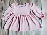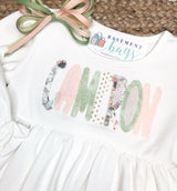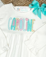 This applique name design just speaks for itself! This true to size, super soft, long or short puffed, ruffled sleeve tunic is made of 95% cotton, 5% spandex. Available in winter white, aqua, and light pink.