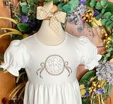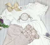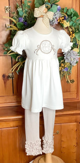 Need something a little nicer than 'everyday' play clothes? This precious outfit is perfect for parties, church, dinners out and works for several seasons. This true to size, super soft, short puffed sleeve tunic is made of 95% cotton, 5% spandex. Shown here in winter white with adorable leggins. Leggins have elastic waist and sassy triple ruffled hem.