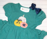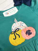 Special occasions call for extra special cuteness! This adorable teal colored ruffled dresses are the perfect pallet for our Fall pumpkin trio and just look at that  tiny little monogram! 100% cotton short sleeve, ruffled bottom dress.