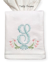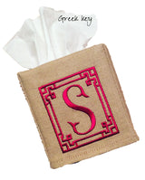 Details matter. Tissue boxes need covering. These fabric, monogrammed tissu box covers slip over box, have finished slit on top and stitched hem.