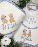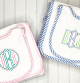 All items are white cotton and edged with gingham trim. Many design options. Towel has an adorable design with name, bib is embroidered with monogram , and the burp has a design and name.