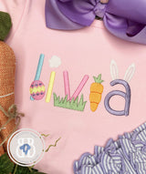 Adorable Easter character name. Each name is a unique combination of characters. Shown stitched in blue, leave a note at checkout if you prefer a different color.