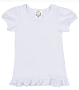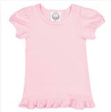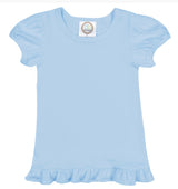 Super soft, 100% cotton ice blue, light pink or white shirt has short sleeves, ruffled bottom.