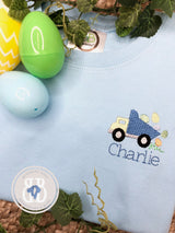 What a great left chest design for the boys, especially the older ones. Mini dump truck, eggs plus name or initials. Sample shown on short sleeve light blue shirt, but is also available in white.