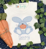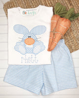 How adorable is this big tooth bunny for the Spring?!? The personalized tee is paired with classic blue and white gingham shorts for timeless little boy good looks! (fabric may vary slightly from example but will be very similar.) Elastic waist shorts are handmade of 100% cotton. Matching short sleeve, crew neck tee is made from super soft, 100% spun cotton.