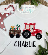 Love Christmas? Love tractors? YES! and YES! then this is the perfect holiday shirt for you! Sample shown in traditional Christmas colors. This would also be adorable in pink!