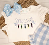 Doesn't get any cuter than this! Short puffed sleeve, ruffle bottom t-shirt with adorable Back to school design and matching shorts. The handmade blue and white gingham shorts have elastic waist, attached ruffle hem, and are made of 100% cotton seersucker fabric. Shirt is made of super soft 100% spun cotton and can be machine washed and line dried.
