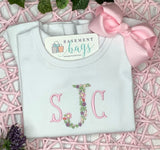 Center letter (last name) is stitched in floral font, side letters (first and middle name) will be classic embroidered font stitched in pink.