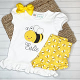 Oh, Honey! it doesn’t get any cuter than this! Short puffed sleeve, ruffle bottom t-shirt with adorable appliqué bee design. Shirt is made of super soft 100% spun cotton and can be machine washed and line dried. (Shirt also available with straight bottom-leave a note if you prefer this style).