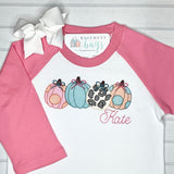 Fall! ... my favorite season! And because we all love 'pumpkin everything' this needs to be in your sweeties wardrobe! This adorable personalized preppy pumpkin shirt is Perfect in every way. Sample stitched on a baseball style shirt with pink sleeves, but also available in white, ruffled tee (short and long sleeve). All shirts are. 100% cotton