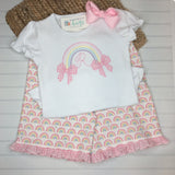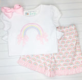 Doesn't get any cuter than this! Short puffed sleeve, ruffle bottom t-shirt with rainbow design and matching shorts. The handmade shorts have elastic waist and attached ruffle hem. Both are made of 100% cotton and can be machine washed and dried.