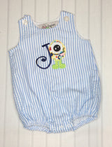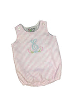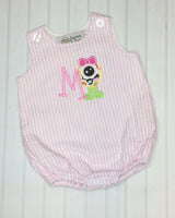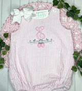 Pink bubble is embroidered with tulip frame and scalloped initial. Blue sample is monogrammed with open circle. Other samples show strawberry monogram swag, cute monster with initial, sweet train, other designs available upon request. Please leave note at checkout to request design.
