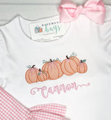 Fall! ... my favorite season! And because we all love 'pumpkin everything' this needs to be in your sweeties wardrobe! This adorable personalized Pumpkins in a row, notice each pumpkin is decorated with a bow or sweet rose bud, is the shirt is Perfect in every way. Super soft, 100% spun cotton tee shirt available with long and short sleeves, ruffled bottom.