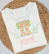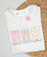Rainy day blues, not a chance with these adorable rainboots! comfy crew neck t-shirt is 100% spun cotton available in short or long sleeve puffed sleeve, ruffled hem.