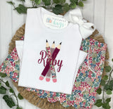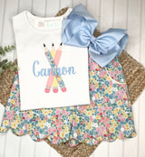 Back to school has never looked so pretty! Blue floral, coral dots, and yellow stripes make up the perfect pencil trio! Purchase shirt and shorts as a set or the shirt only. Shirt has short puffed sleeves and ruffled bottom. Handmade shorts have with elastic waist, pockets and scallop hem.. Both are made of 100% cotton and can be machine washed and best if hung to dry.