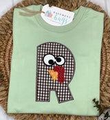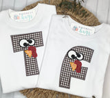 Adorable gobble applique letter is perfect for Fall holidays. Design to be stitched on WHITE shirt, available in all sizes, unisex or ruffled bottom, long and short sleeve.