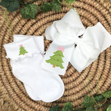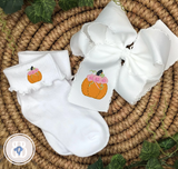 Adorable white fold down, ruffled socks with tiny embroidered design or monogram.